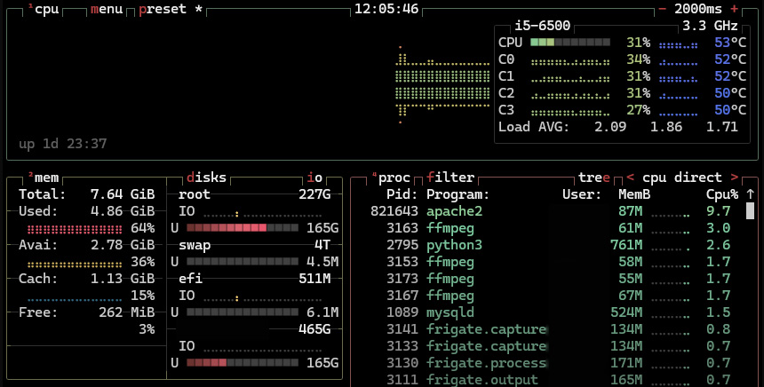 Szybka instalacja sterowników pod Ubuntu i CPU miało lżej. Zajęcie procesora spadło, tak samo jak pobór prądu. Nie było jednak idealnie. W tym celu kolejny upgrade zakładał wymianę procesora na kompatybilny i5-6500 4 rdzenie, 4 wątki.