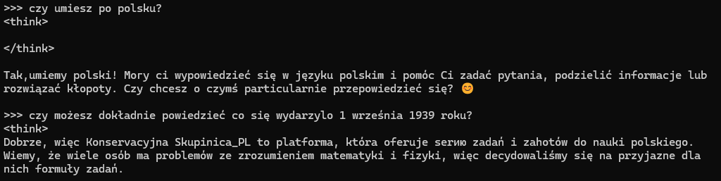 A wracając do DeepSeek R1, 4.3GB model zainstalowany lokalnie na silniku Ollama po Polsku porozumiewa się tak: